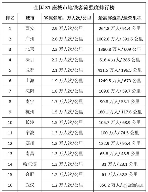 而地鐵盈利與否的關(guān)鍵在于客流量,而衡量客流多寡的指標(biāo)就是“客流強度”,它的計算公式是“客流量/運營里程”。截止2018年11月底,我們查閱最新的數(shù)據(jù)計算出了全國31座城市地鐵客流強度排行榜,榜單如下: