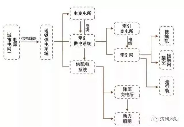首先,簡(jiǎn)單來說地鐵供電由供電公司通過單獨(dú)的輸電線路到達(dá)主變電所,再通過環(huán)網(wǎng)電纜分配到下級(jí)牽混所、降壓所,用作列車運(yùn)行和車站動(dòng)力照明等用途。地鐵列車主要依靠牽引供電系統(tǒng)提供動(dòng)力,牽引供電系統(tǒng)一般包括:牽引變電所、接觸網(wǎng)、回流電路。在我國(guó),地鐵供電一般采用10~35KV的交流電,通過牽引變電所變壓整流為1500V直流電后,由牽引網(wǎng)給地鐵車輛提供電源。