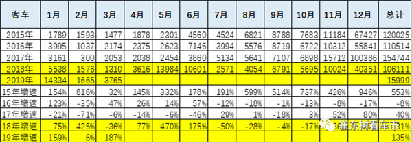 2019年新能源車增長總體很強,其中乘用車增長突出,新能源客車19年1-3月1.9萬臺,同比增長135%,增長表現(xiàn)突出,這也是政策推動新能源車轉(zhuǎn)型乘用車高質(zhì)量增長的效果充分體現(xiàn)。19年1-3月代表技術(shù)趨勢的乘用車的表現(xiàn)突出,歷年1-3月客車占比僅有全年的5%,19年占比預(yù)計達到15%左右,目前看改善較大。