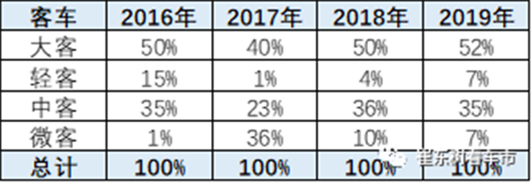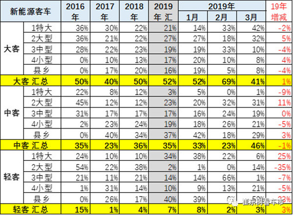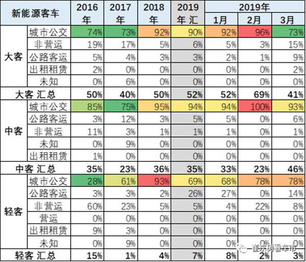 新能源客車的城市公交類占比逐步提升。大客2019年公交的占比相對2018年1季度在小幅提升。