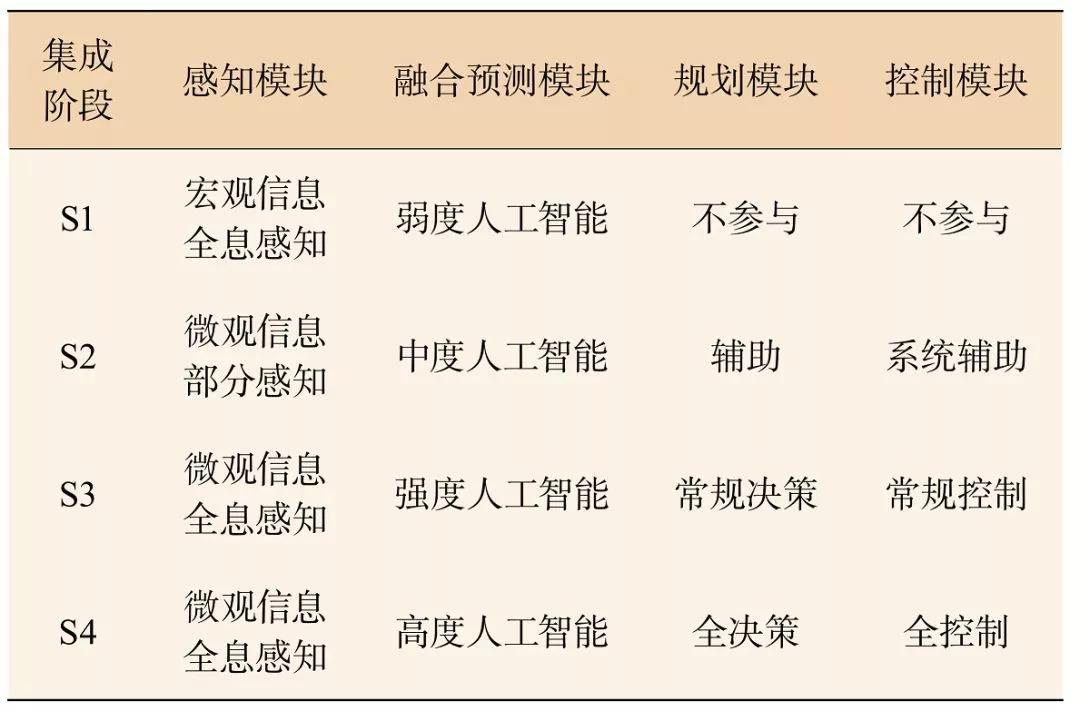 智能網(wǎng)聯(lián)交通系統(tǒng)包括感知模塊、融合預(yù)測模塊、規(guī)劃模塊和控制模塊等 4 個(gè)關(guān)鍵部分。在系統(tǒng)集成化不同階段,關(guān)鍵模塊參與程度不同,如表 1 所示: