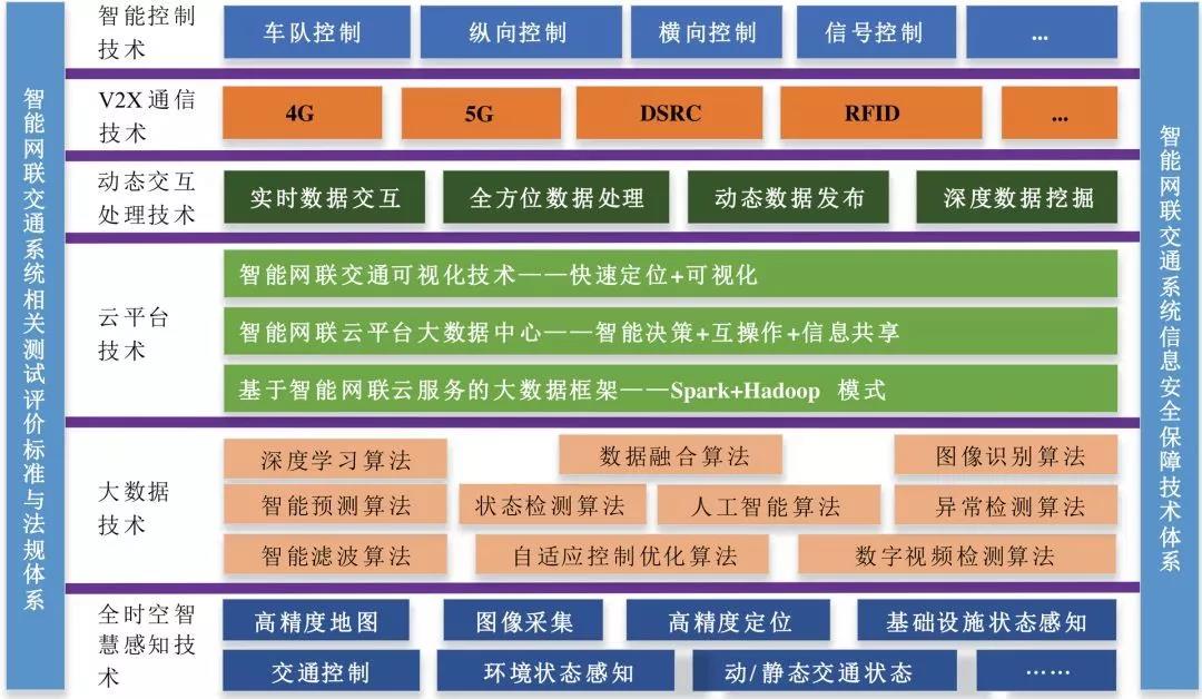 b)大數(shù)據(jù)技術(shù):智能網(wǎng)聯(lián)交通系統(tǒng)需完成大批量數(shù)據(jù)處理,實(shí)時(shí)挖掘有效交通信息,實(shí)現(xiàn)融合預(yù)測和路網(wǎng)優(yōu)化控制等功能,主要包括人工智能、深度學(xué)習(xí)算法、智能預(yù)測、數(shù)據(jù)融合、圖像識(shí)別、自適應(yīng)優(yōu)化控制等技術(shù)。