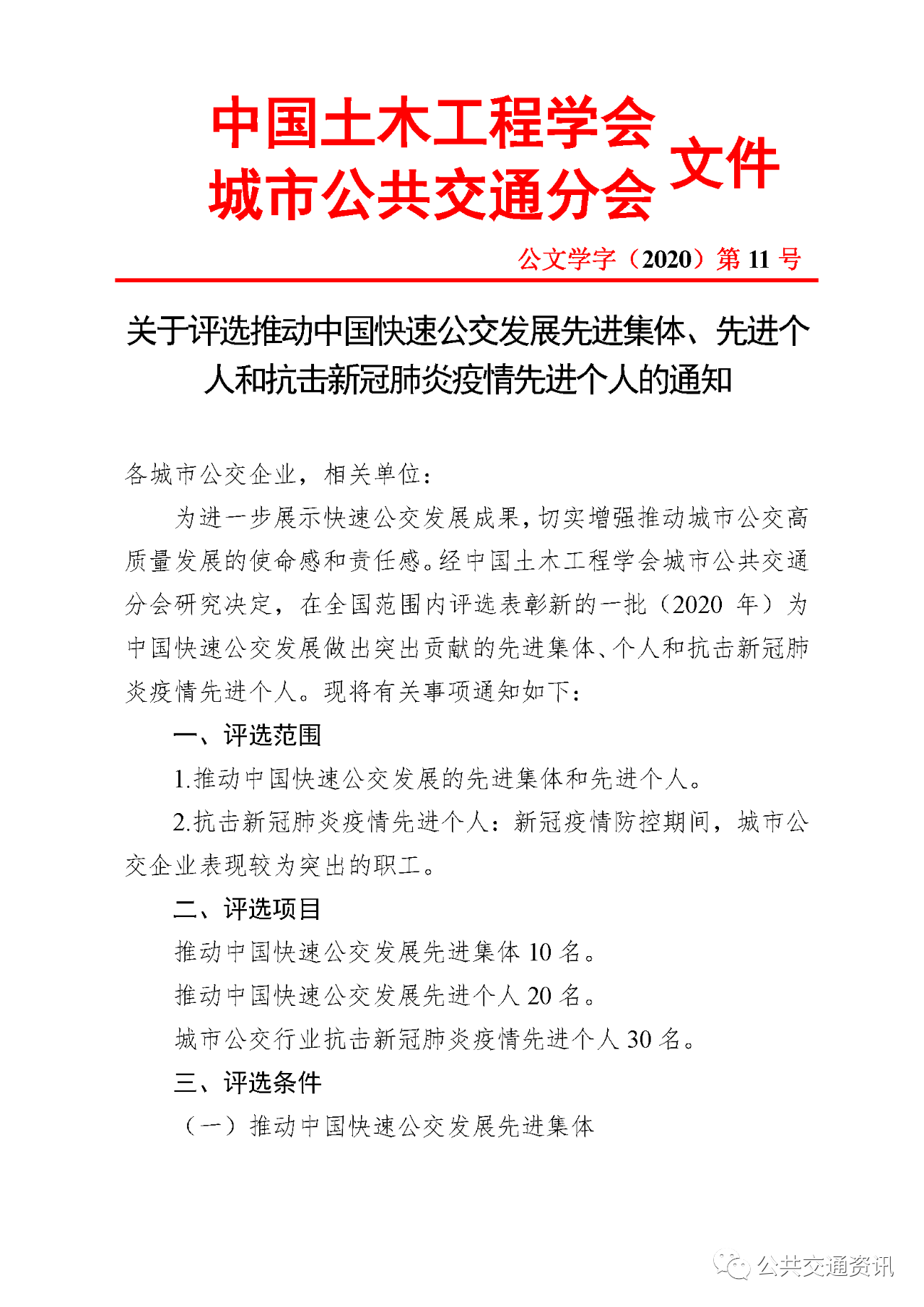為進(jìn)一步展示快速公交發(fā)展成果,切實(shí)增強(qiáng)推動(dòng)城市公交高質(zhì)量發(fā)展的使命感和責(zé)任感。經(jīng)中國(guó)土木工程學(xué)會(huì)城市公共交通分會(huì)研究決定,在全國(guó)范圍內(nèi)評(píng)選表彰新的一批(2020年)為中國(guó)快速公交發(fā)展做出突出貢獻(xiàn)的先進(jìn)集體、個(gè)人和抗擊新冠肺炎疫情先進(jìn)個(gè)人?,F(xiàn)將有關(guān)事項(xiàng)通知如下: