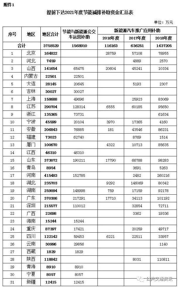 根據(jù)《關于2016-2020年新能源汽車推廣應用財政支持政策的通知》(財建〔2015〕134號)、《關于完善城市公交車成品油價格補助政策 加快新能源汽車推廣應用的通知》(財建〔2015〕159號)、《關于調整新能源汽車推廣應用財政補貼政策的通知》(財建〔2016〕958號)、《關于調整完善新能源汽車推廣應用財政補貼政策的通知》(財建〔2018〕18號)、《關于進一步完善新能源汽車推廣應用財政補貼政策的通知》(財建〔2019〕138號)、《關于支持新能源公交車推廣應用的通知》(財建〔2019〕213號)、《關于完善新能源汽車推廣應用財政補貼政策的通知》(財建〔2020〕86號)等文件有關規(guī)定,現(xiàn)提前下達你?。▍^(qū)、市)2021年節(jié)能減排補助資金(具體見附件),用于2019年度節(jié)能與新能源公交車運營補助資金、2016-2018年度新能源汽車推廣應用補助資金清算。