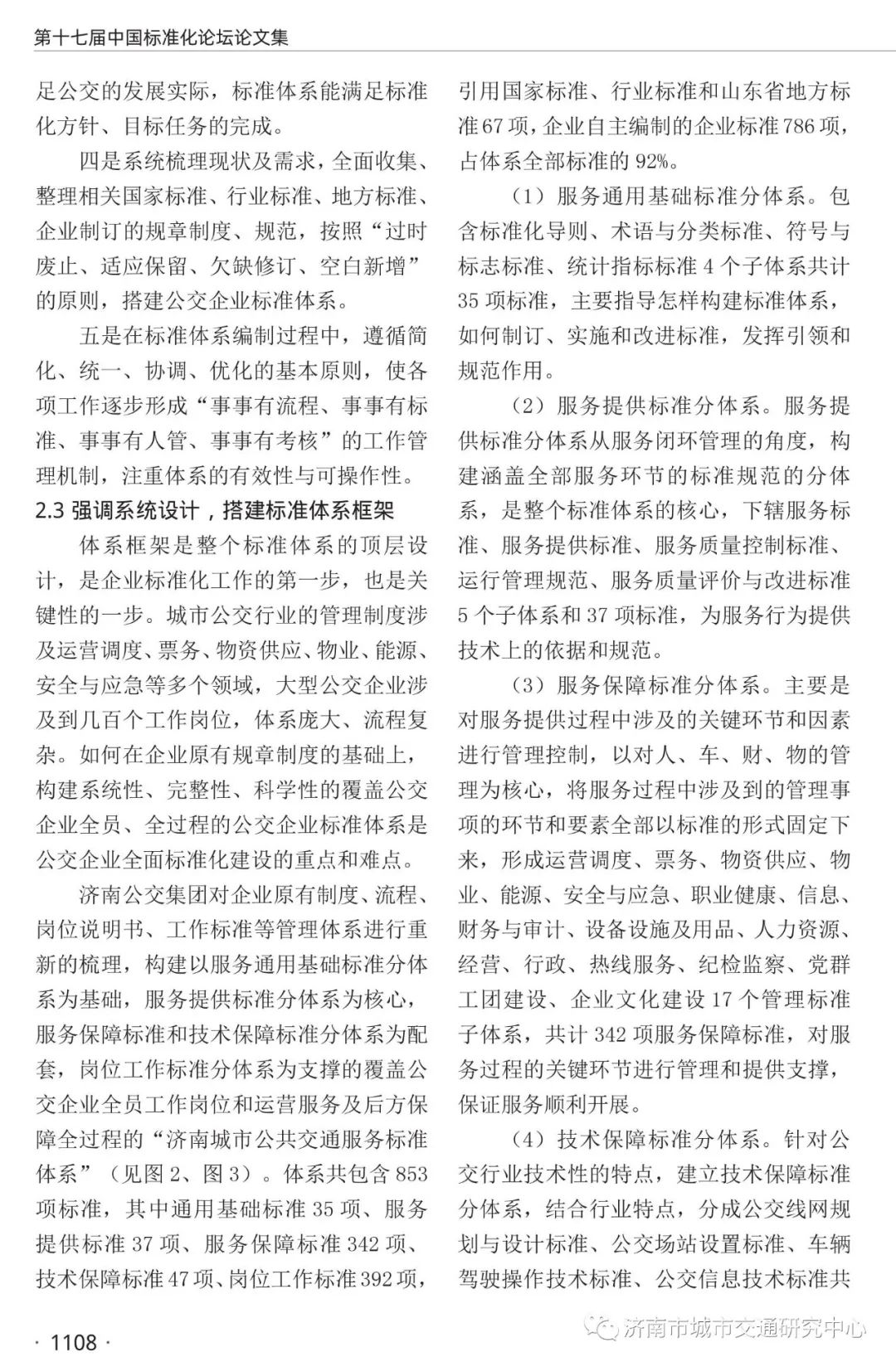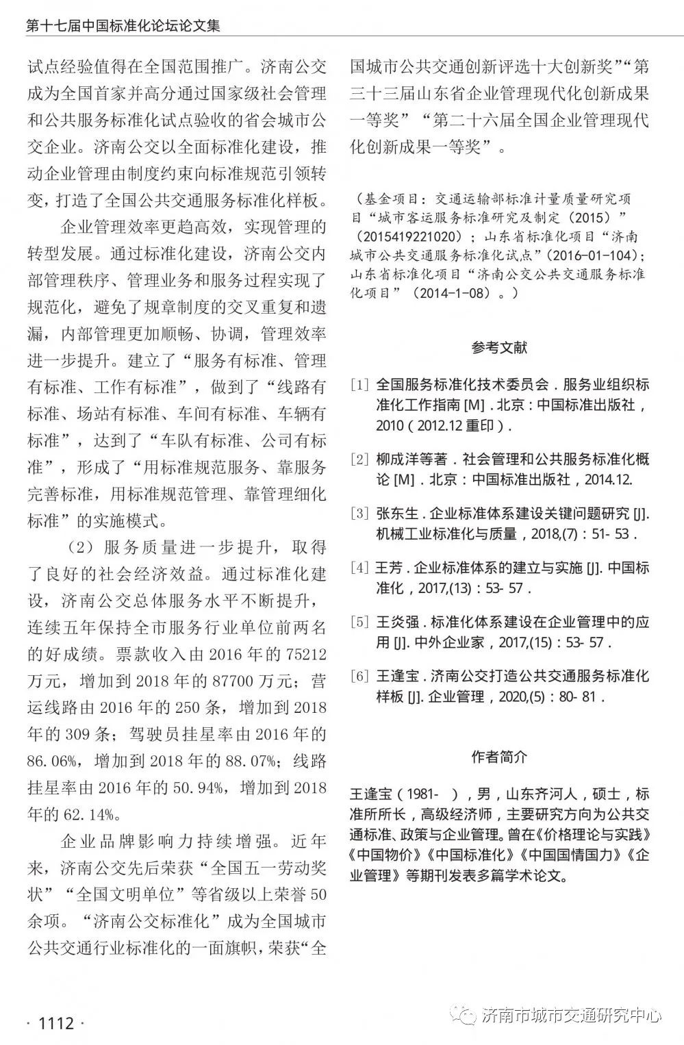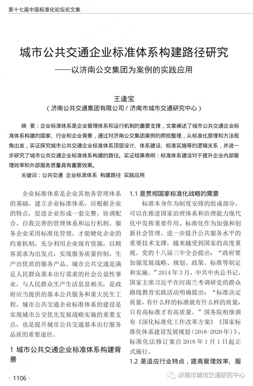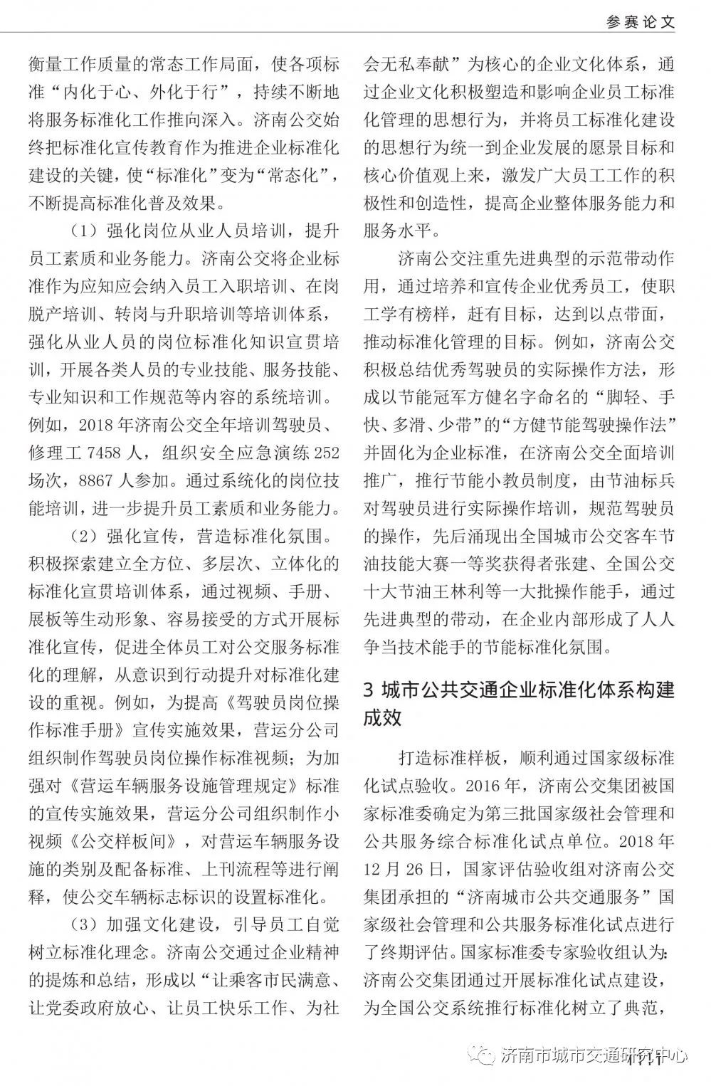 近日,濟南市城市交通研究中心標準化研究所所長、高級經(jīng)濟師王逢寶撰寫的文章《城市公共交通企業(yè)標準體系構(gòu)建路徑研究——以濟南公交集團為案例的實踐應用》被第十七屆中國標準化論壇《國家標準化與制造強國戰(zhàn)略之實施》騰訊杯論文集收錄。文章闡述了城市公共交通企業(yè)標準體系構(gòu)建的國家、行業(yè)和企業(yè)背景,通過對濟南公交集團案例的爬梳整理,從標準化原理和方法視角出發(fā),實證探究城市公共交通企業(yè)標準體系頂層設計、體系建設、標準實施等的邏輯關(guān)系,并進一步研究了城市公共交通企業(yè)標準體系構(gòu)建的路徑。