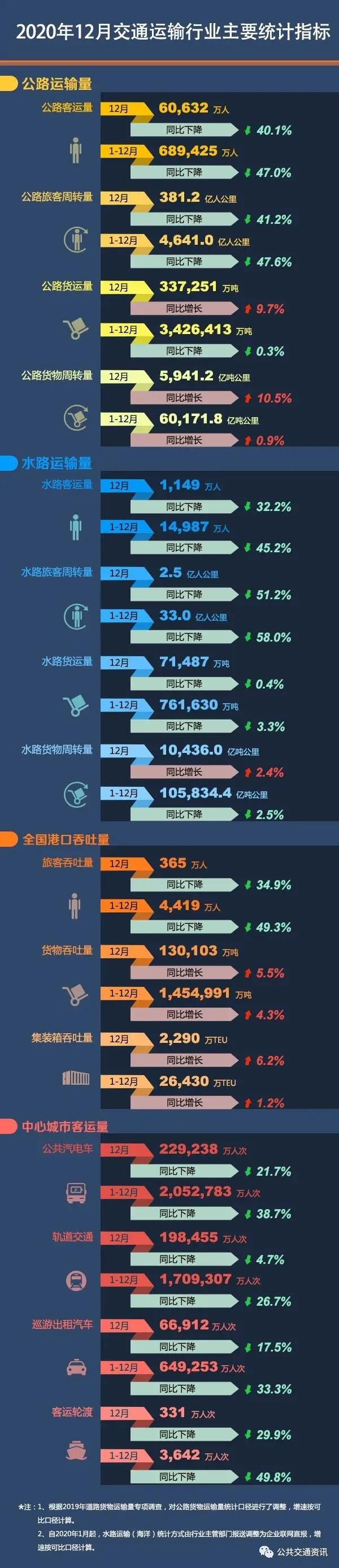 公共汽電車:12月客運量229,238萬人次,同比下降21.7%;1~12月客運量2,052,783萬人次,同比下降38.7%。