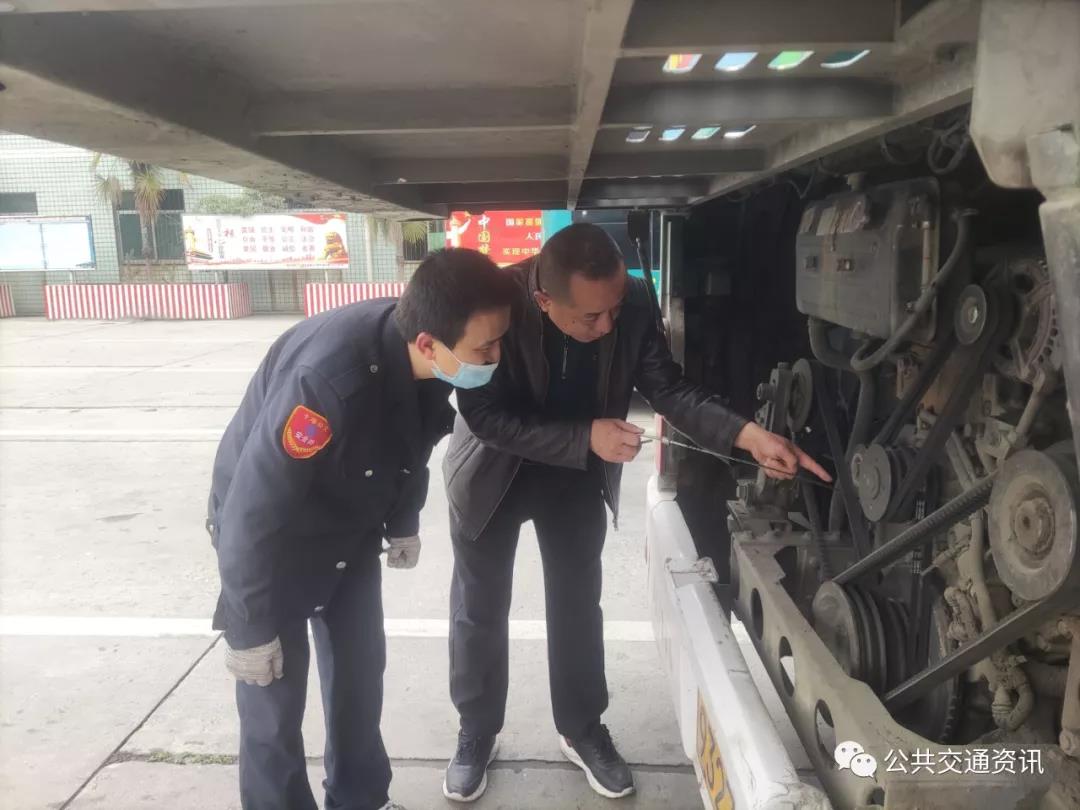 十堰公交客運五公司車隊管理人員與駕駛員共同檢查車況