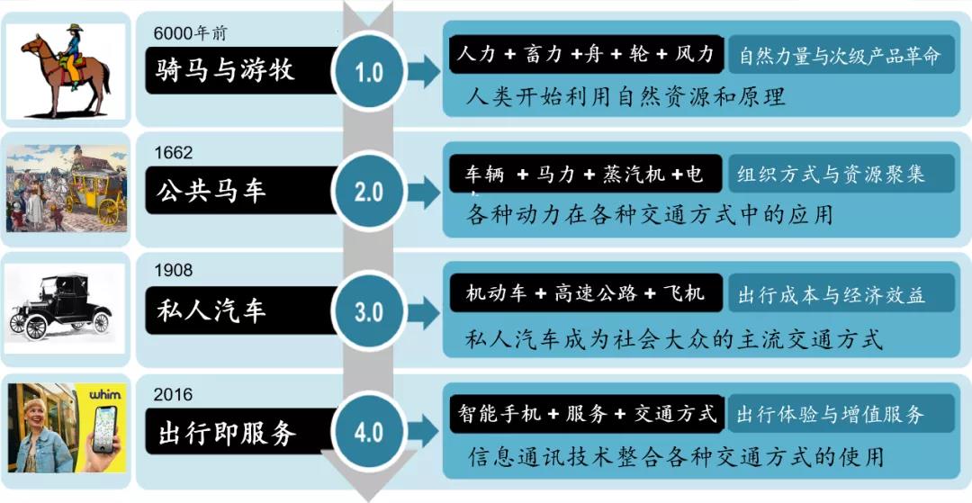人類社會從游牧進入農業(yè)時期,馴化動物之后開始利用畜力,騎馬成為第一次出行革命的標志;封建社會后期開始有組織地利用社會資源,公共馬車成為第二次出行革命的標志;工業(yè)革命時期開始利用機械和動力,私人汽車成為第三次出行革命的標志;現在從工業(yè)到信息社會利用信息與通訊技術,移動手機的應用程序成為第四次出行革命的標志。