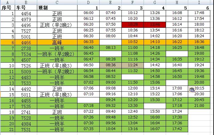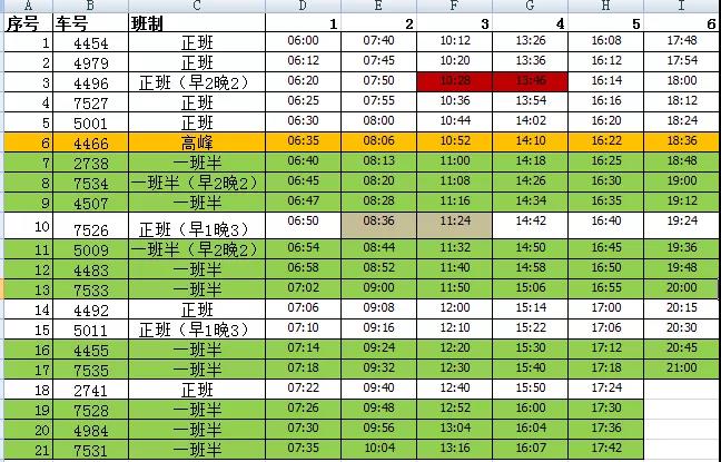 調(diào)整原則:正班車早晚頂點(diǎn),早低峰按班序正向排,發(fā)車點(diǎn)正向排;晚低峰按照班序反向排,發(fā)車點(diǎn)反向排。
