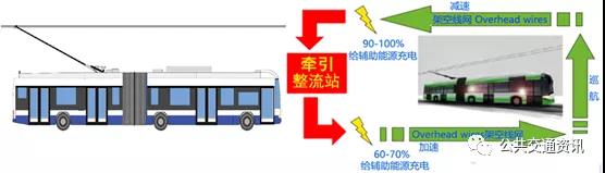 無軌電車與純電動公交車都安裝有再生制動,再生制動的意思是車輛制動時(shí),電動機(jī)的發(fā)電機(jī)工況,把車輛的制動能轉(zhuǎn)變?yōu)殡娔懿檐囕d儲能設(shè)備充電。如果制動電流過大,不能通過有效的對儲能設(shè)備充電并產(chǎn)生制動扭矩時(shí),純電動公交車則將制動電能通過電渦流剎車或電阻消耗,在此情況下而無軌電車則可以將多余的電能反饋至架空線網(wǎng),實(shí)現(xiàn)資源“共享”,如果在長下坡路段,無軌電車的這種節(jié)能效果就純電動公交車要好得多,而且車輛制動時(shí)底盤的環(huán)境溫度也會比純電動公交車低得多。