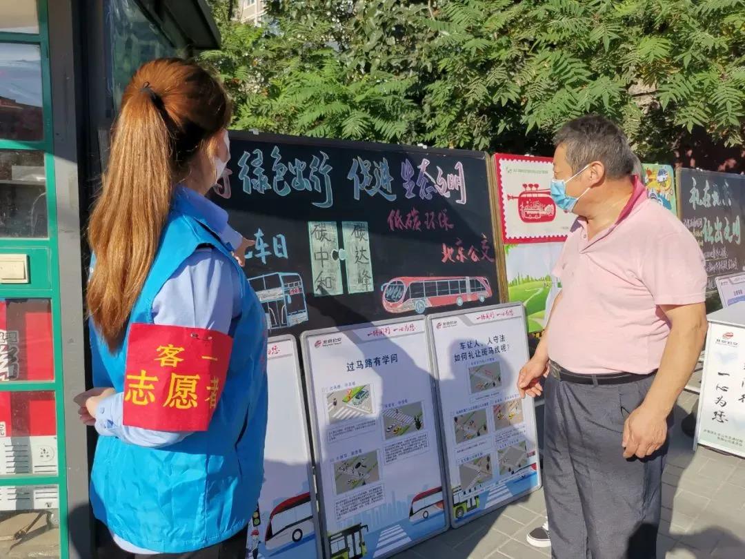 北京公交志愿者通過(guò)海報(bào)宣傳綠色出行。