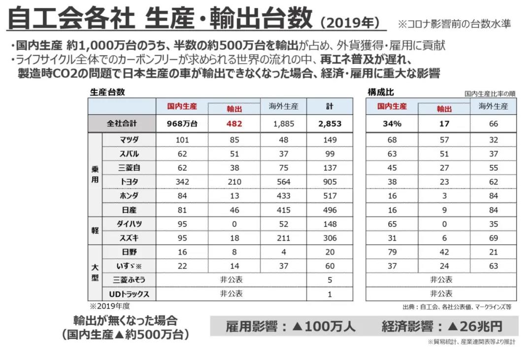 日本汽車工業(yè)年產(chǎn)約1000萬(wàn)輛汽車。其中一半、即500萬(wàn)輛汽車出口到世界其他國(guó)家。如果把內(nèi)燃機(jī)作為碳排放的敵人來(lái)消滅,將會(huì)導(dǎo)致大多數(shù)規(guī)格的汽車無(wú)法生產(chǎn),影響出口理所當(dāng)然、必在其中。