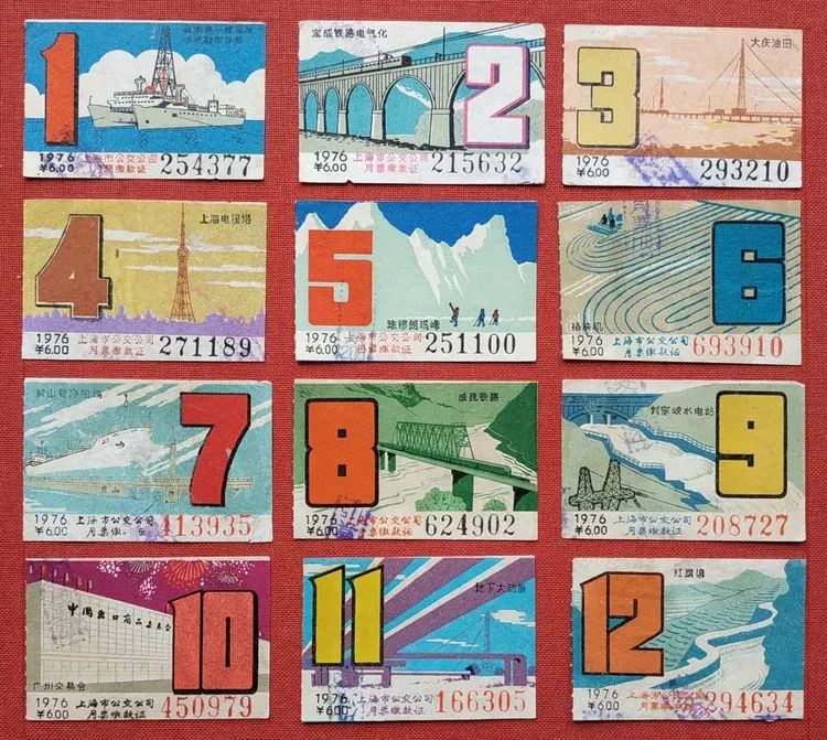 欣賞1976年全年的12枚公交月票花,其內容與形式,也達到了一個全新的高度。一枚小小的月票花,好似一幅袖珍的美術作品。每幅圖案布局合理,匠心獨到,氣勢壯觀,美輪美奐。畫面中每個阿拉伯數字,在整幅畫面上的安置定位都是那么的恰到好處。12枚月票花上的內容名稱分別是,1月份 :我國第一艘海洋地質勘探浮船;2月份 :寶成鐵路電氣化;3月份 :大慶油田;4月份 :上海電視塔;5月份 :珠穆朗瑪峰;6月份 :插秧機;7月份 :黃山號浮船塢;8月份 :成昆鐵路;9月份 :劉家嶺水電站;10月份 :廣州交易會;11月份 :地下大動脈;12月份 :紅旗渠。