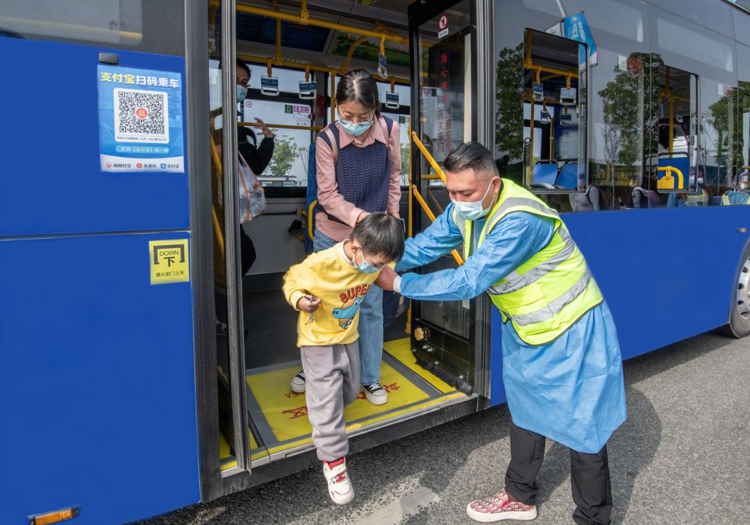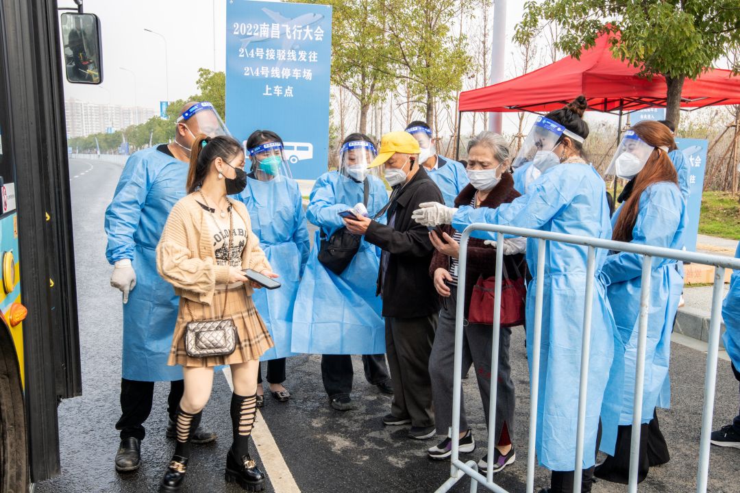 南昌公交運輸集團嚴格落實飛大會期間疫情防控政策,對參與運輸的駕駛員和工作人員進行健康監控;對車輛進行提前消殺,要求現場工作人員穿著隔離服、手套、面罩等加強個人防護;對乘客實行“一掃一測三查驗”,為乘客的健康安全觀展之旅,筑起一道出行“放心墻”。同時,在重要路口、人流集中點及專線沿途安排工作人員,負責引導乘客上車、幫助防疫健康查驗、答疑解惑等,并向乘客發放乘車引導卡,提示乘車路線方便回程,盡展城市窗口文明形象,廣受觀展市民一致好評。(攝影:遲發杰)
