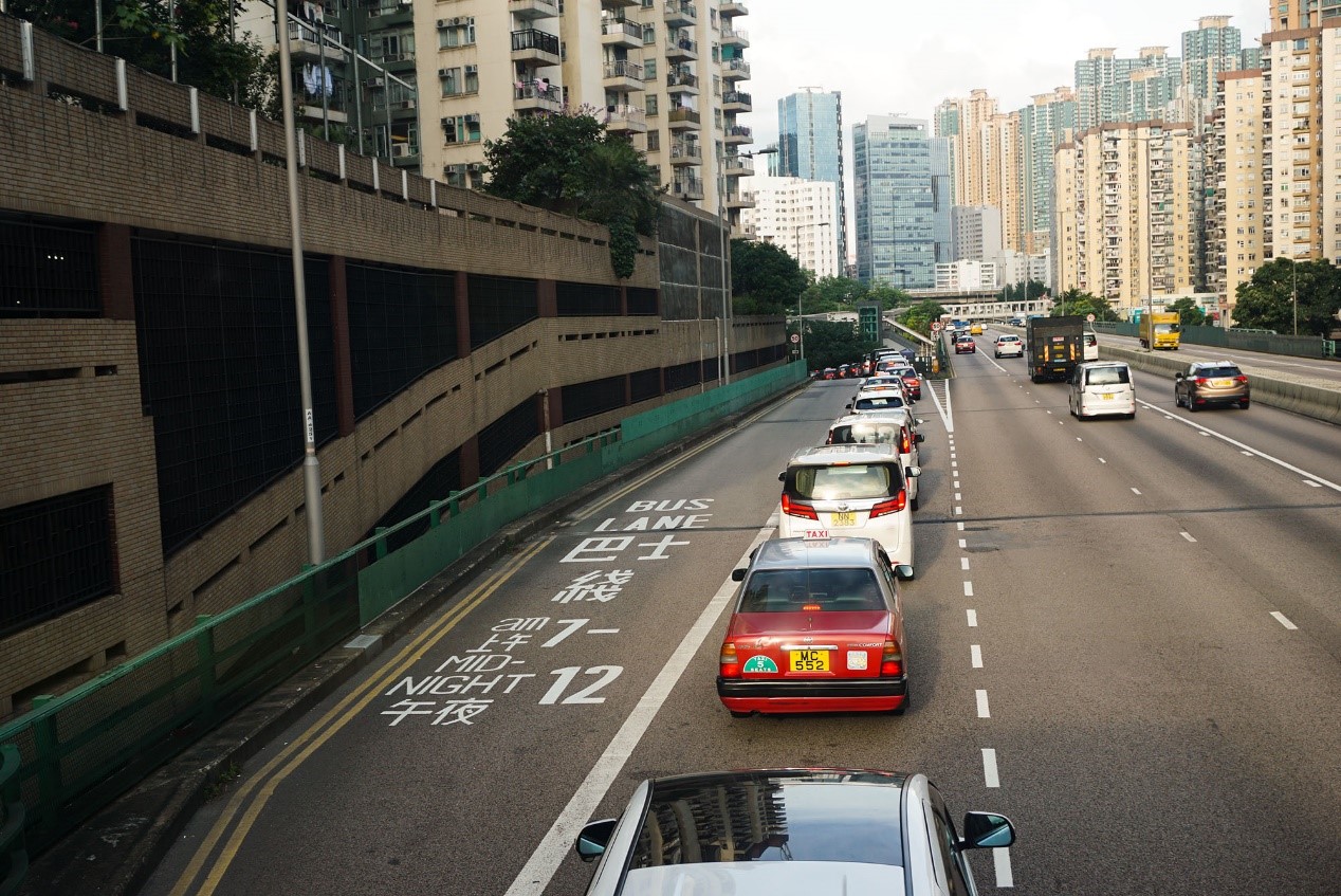 香港美孚的專用道,巴士可以越過匝道排隊的私人車輛,且其每日生效期長達17小時(攝于2019年6月)。
