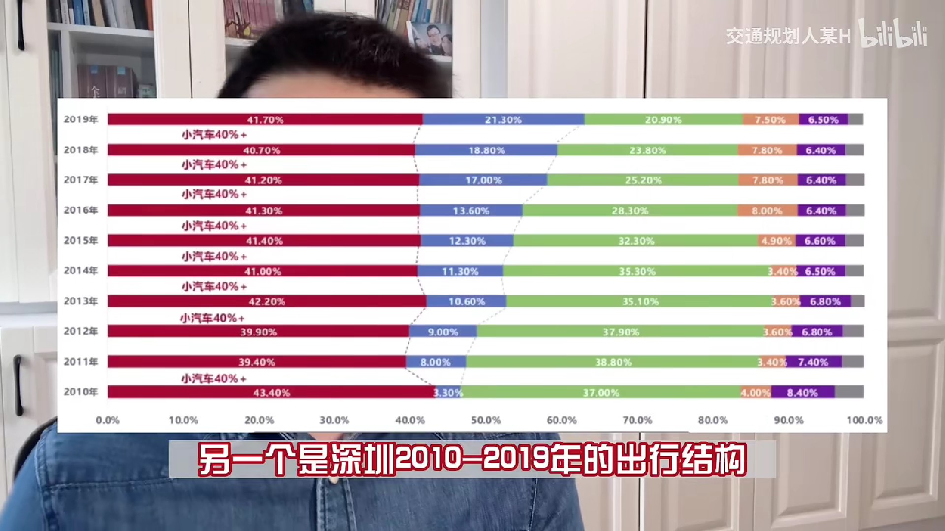 深圳的 出行方式分擔率,藍色為地鐵,綠色為公共汽車。