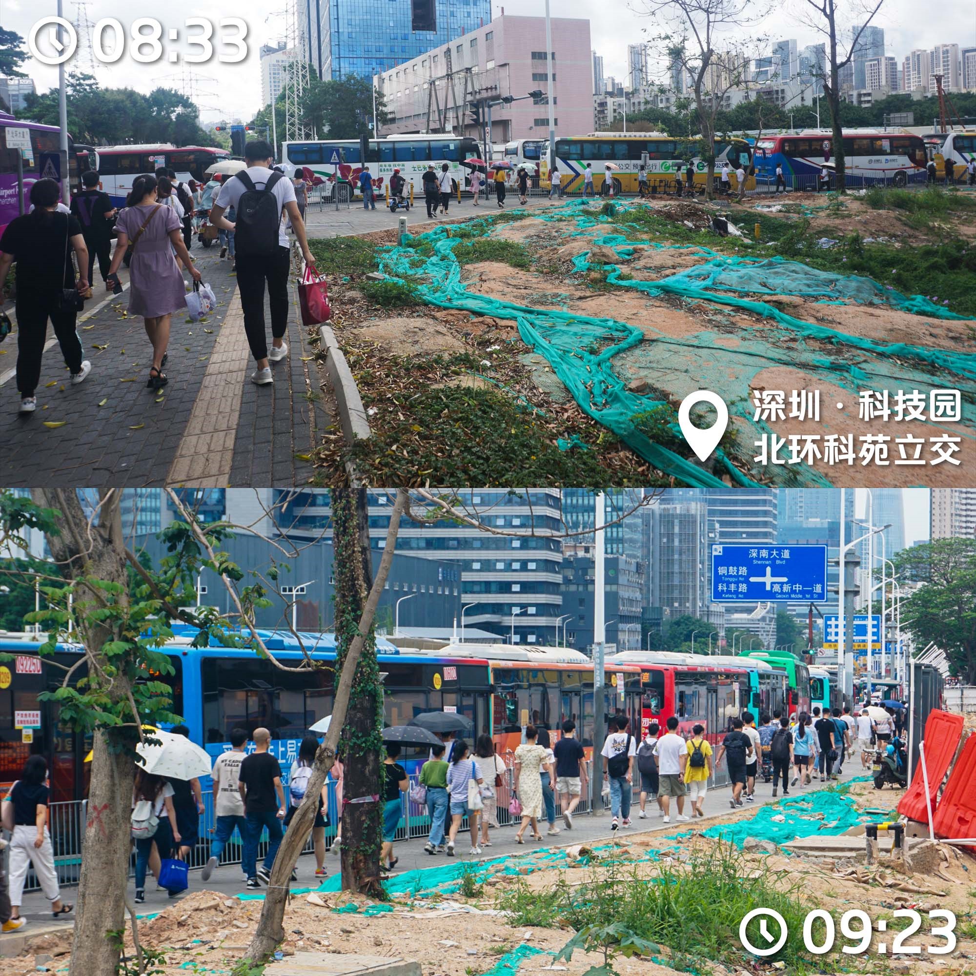 早上步履匆匆的人潮——因為公共汽車在擁堵的車龍中難以動彈,大廠青年們提前2個站下車步行趕往辦公室——深圳科技園(高新園)就是土地開發和運輸規劃配合失敗的典型:改變土地用途產生的巨量工作崗位,和大量配建停車位一起壓垮了本就孱弱的路網(攝于2021年5月)