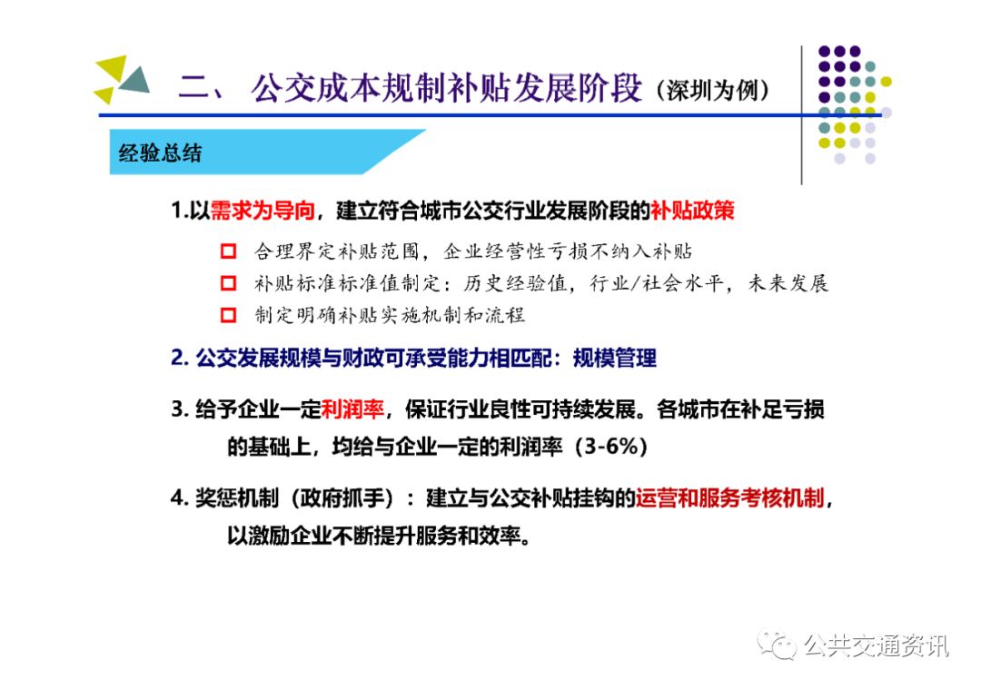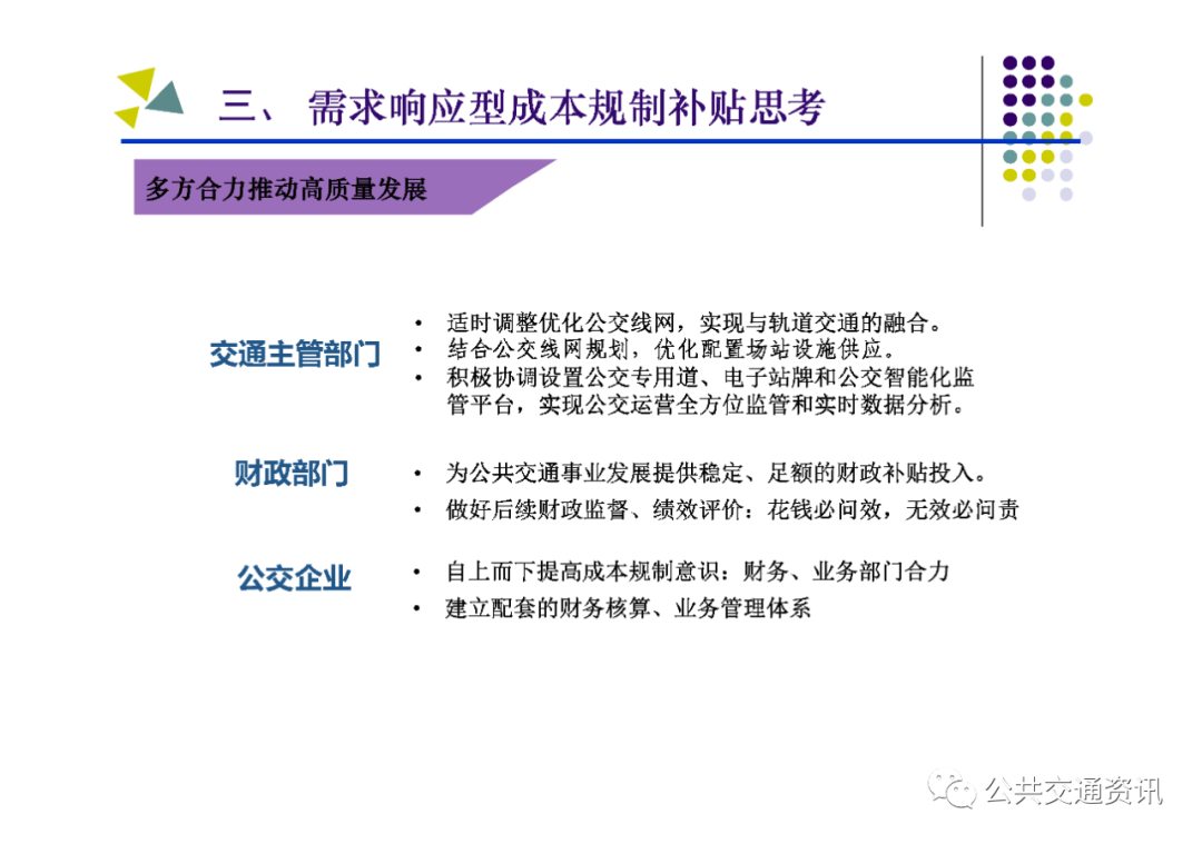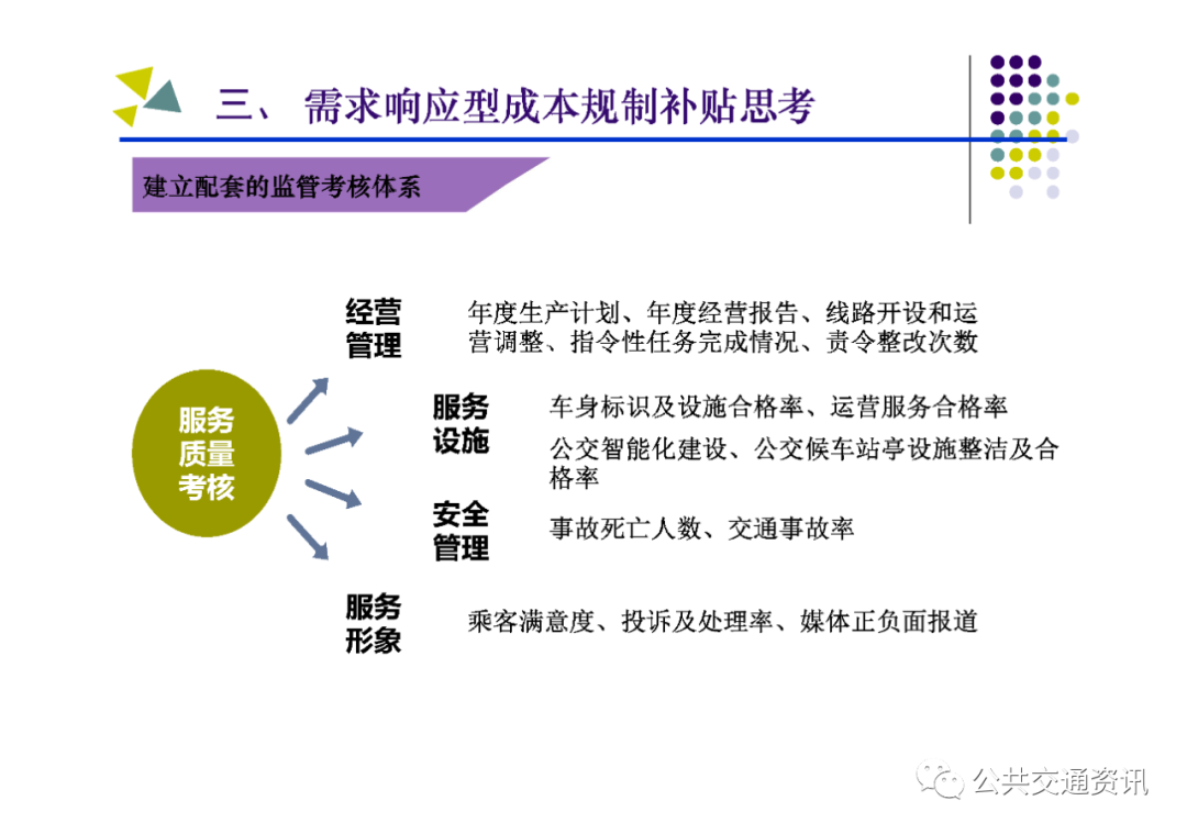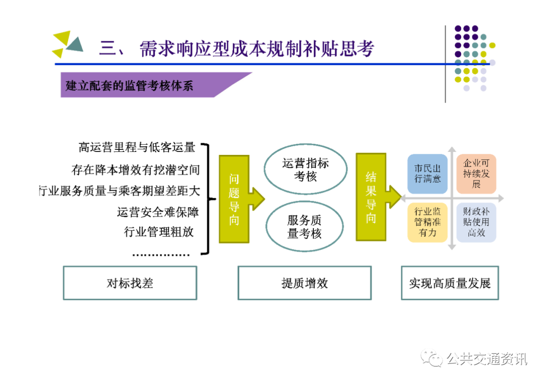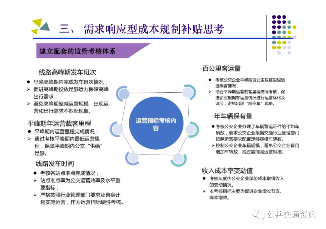 (二)需要把握的關鍵點:一是對公交需求進行科學管理,區分重點區域、重點線路、重點時段,結合實際制定差異化補貼策略;二是建立配套的監管考核體系,堅持問題導向,按照對標找差、體質增效、實現高質量發展的要求,深化運營指標和服務質量考核;三是建設配套的智能化運營調度平臺,以信息化帶動行業發展的規范化、標準化、科學化;四是多方合力推動行業高質量發展,財政、國資、交通運輸、公安交警及公交運營企業各負其責、各盡其職,才能建設人民滿意的公共交通。