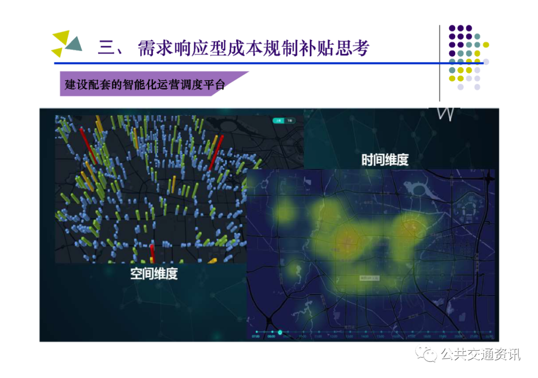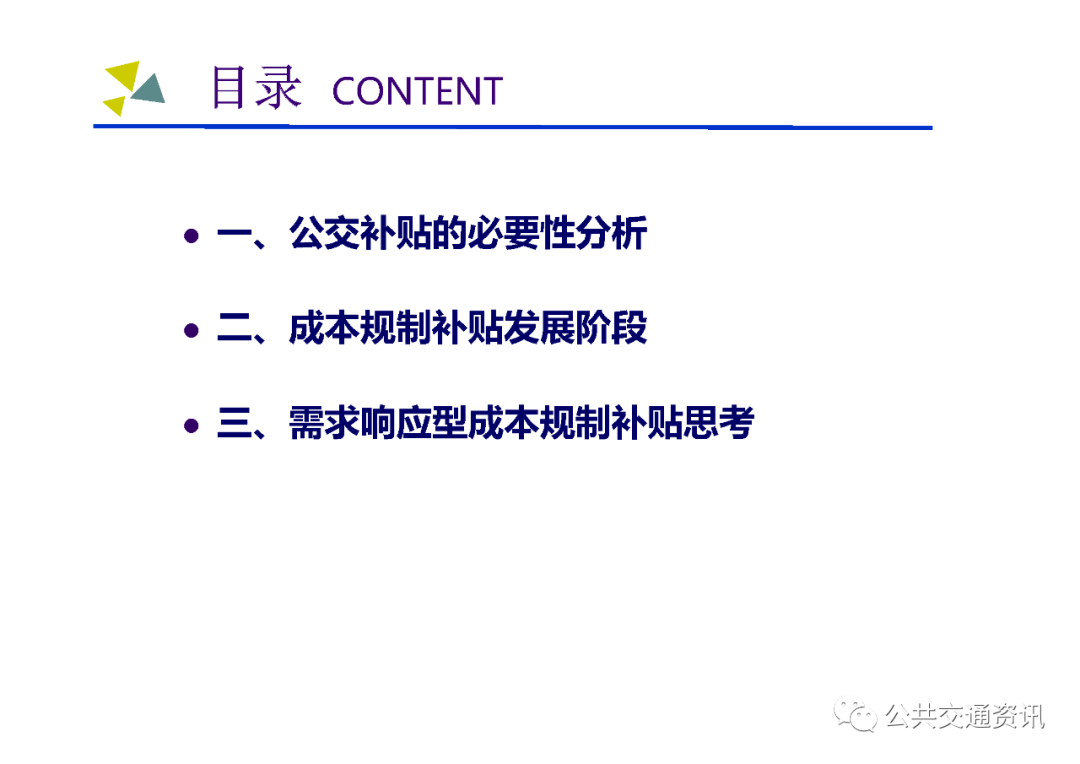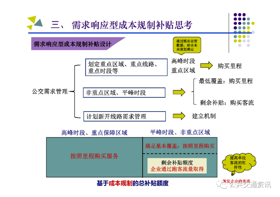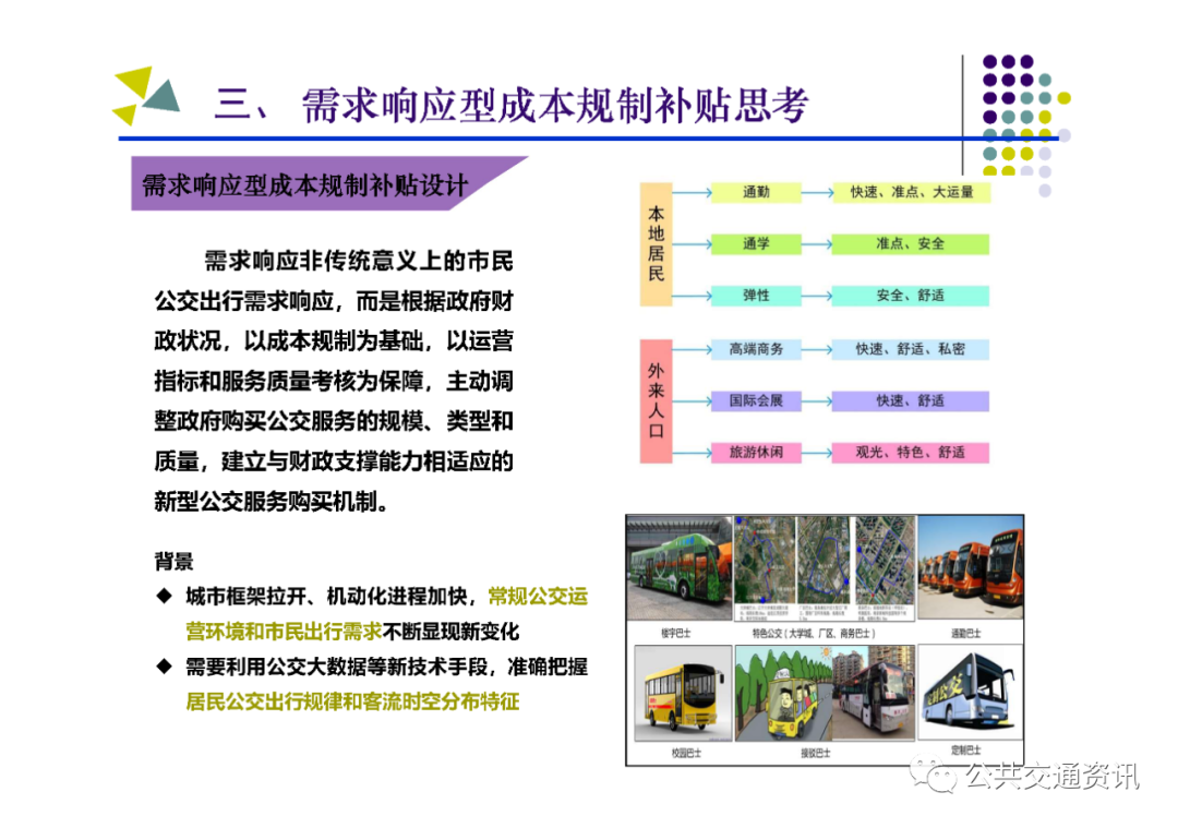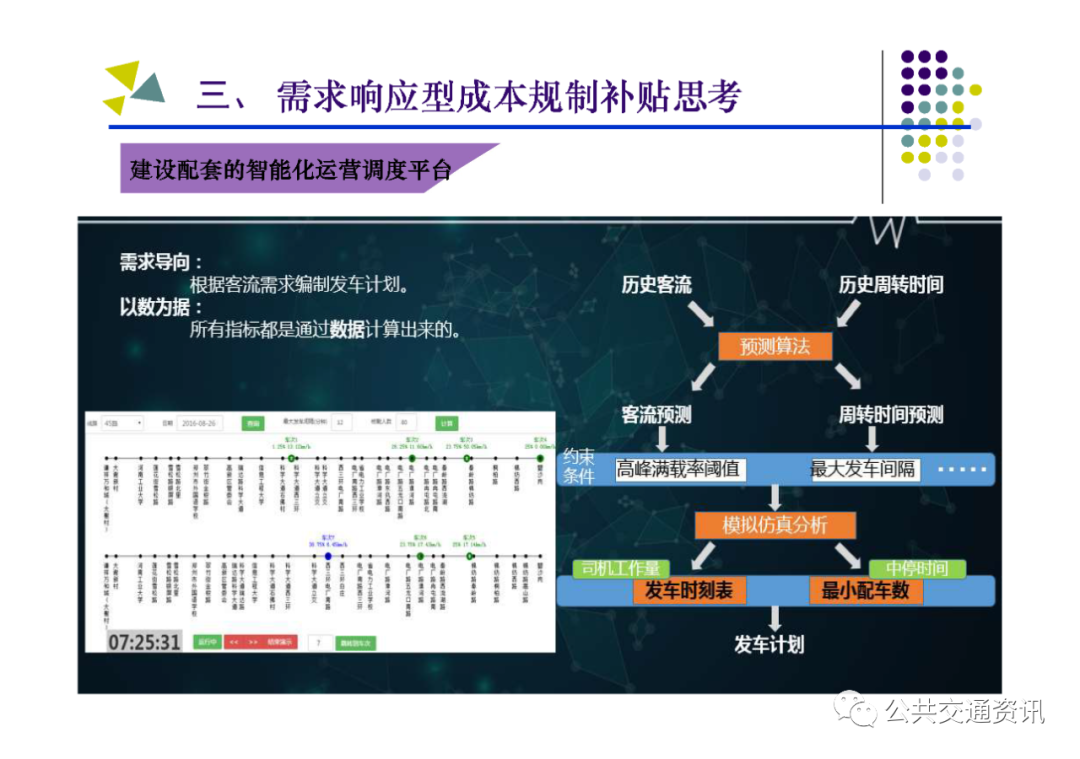 (二)需要把握的關鍵點:一是對公交需求進行科學管理,區分重點區域、重點線路、重點時段,結合實際制定差異化補貼策略;二是建立配套的監管考核體系,堅持問題導向,按照對標找差、體質增效、實現高質量發展的要求,深化運營指標和服務質量考核;三是建設配套的智能化運營調度平臺,以信息化帶動行業發展的規范化、標準化、科學化;四是多方合力推動行業高質量發展,財政、國資、交通運輸、公安交警及公交運營企業各負其責、各盡其職,才能建設人民滿意的公共交通。