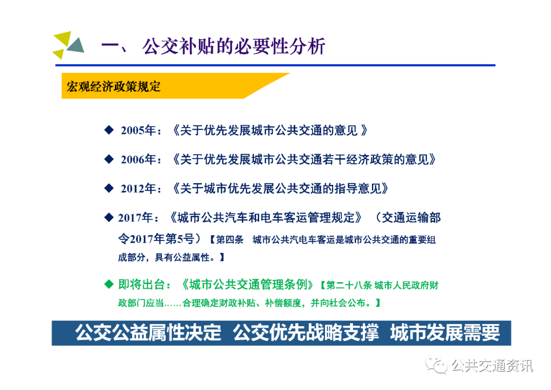 二是宏觀政策有明確的規定,中共中央、國務院、交通運輸部等部門出臺和即將出臺的政策、法規和部門規章,均明確城市人民政府應當對公交企業執行低票價造成虧損進行補貼補償,合理確定公交財政補貼額度;