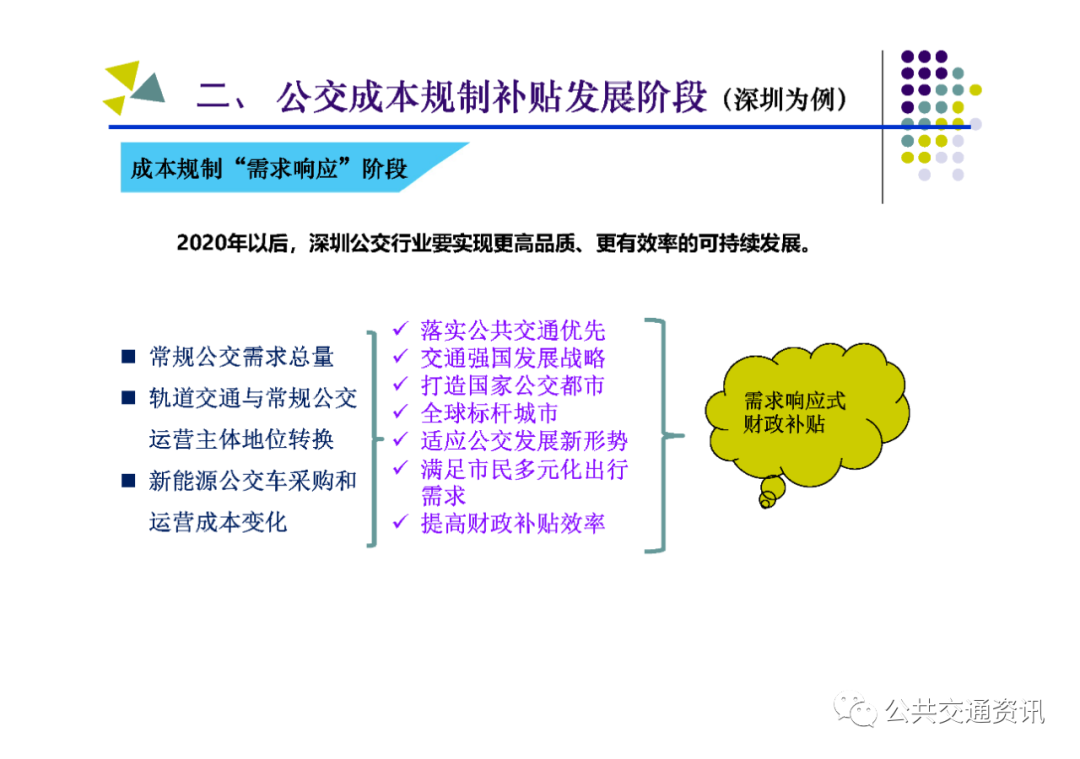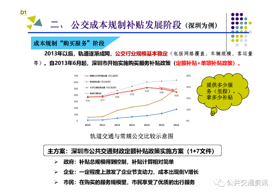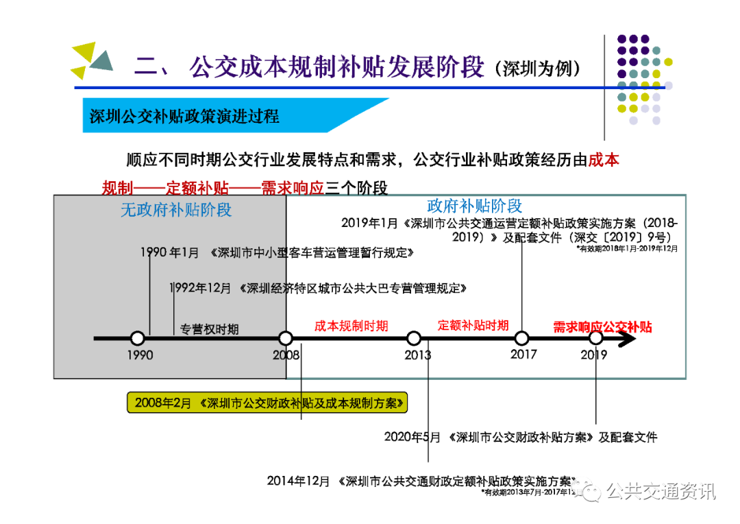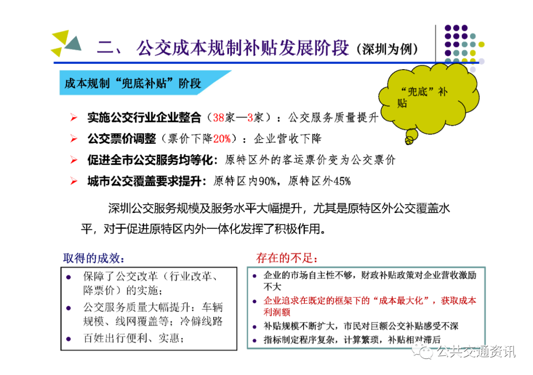一是成本規制補貼階段:2008年2月,深圳市為解決公交行業企業主體多、票價偏高、公交服務覆蓋不足、城鄉客運二元發展等問題,出臺《深圳市公交財政補貼及成本規制方案》,建立了以成本規制財政補貼政策,公交企業有38家整合為3家,票價下降20%,車輛規模和線網覆蓋率明顯提高,冷僻線路陸續開設,公交服務保障能力迅速提升。