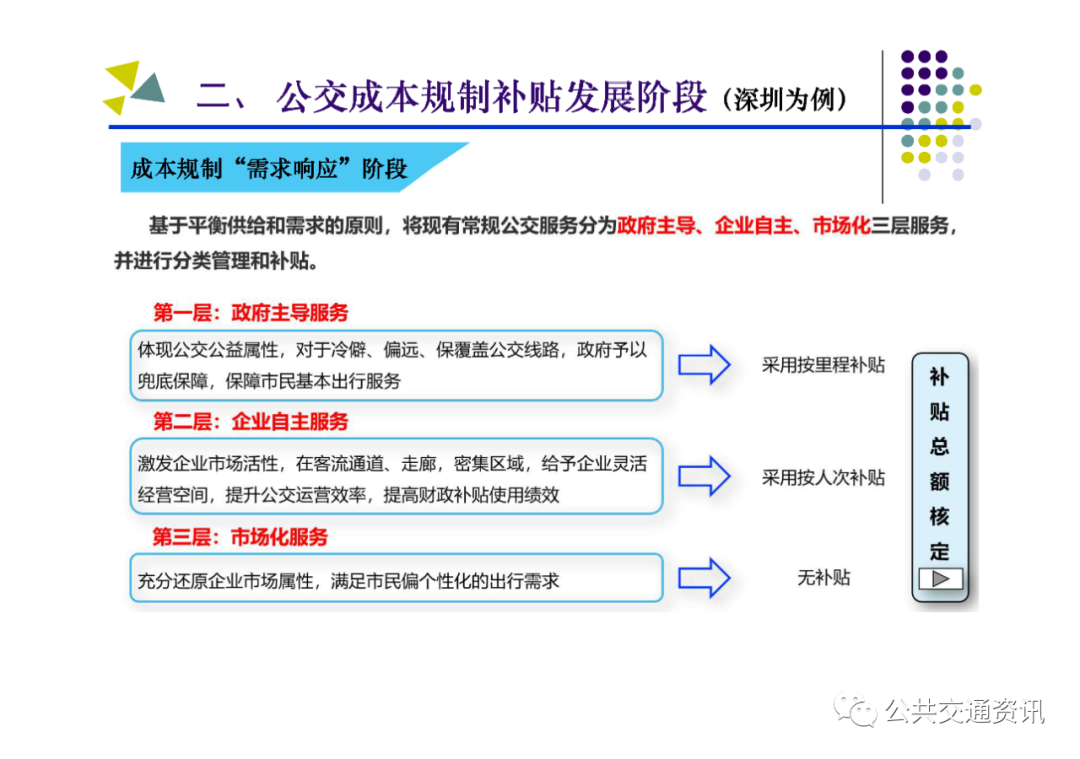 三是成本規制“需求響應”階段:2020年,深圳市公交需求總量基本穩定,軌道交通與常規公交運營主體地位轉換,加之新能源公交車推廣應用及運營成本的變化,破解公交財政補貼資金持續上漲難題,特別是為打造國家公交都市全球標桿城市,進一步提升財政補貼效率,實現更高品質、更有效率的可持續發展,深圳市創新公交發展理念,出臺全新的公交財政補貼方案及配套文件,基于平衡供給和需求的原則,將現有公交服務分為政府主導、企業自主、市場化三層服務,并進行分類管理和補貼,達到保基本民生、保重點區域、推動行業高質量發展的政策目標。