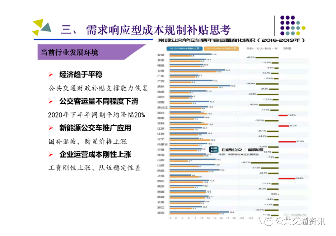 當前,受疫情影響,國內經濟尚處于恢復發展階段,各城市都面臨公交財政補貼支撐能力不足、公交客運量不同程度下滑、新能源公交車推廣應用國補退坡及購置價格上漲、公交運營成本持續走高等問題,急需建立符合城市公交行業發展階段的補貼政策,做到財政可承受、行業可持續、市民可負擔。這種背景下,思考建立需求響應型成本規制補貼機制,是十分必要和迫切的。