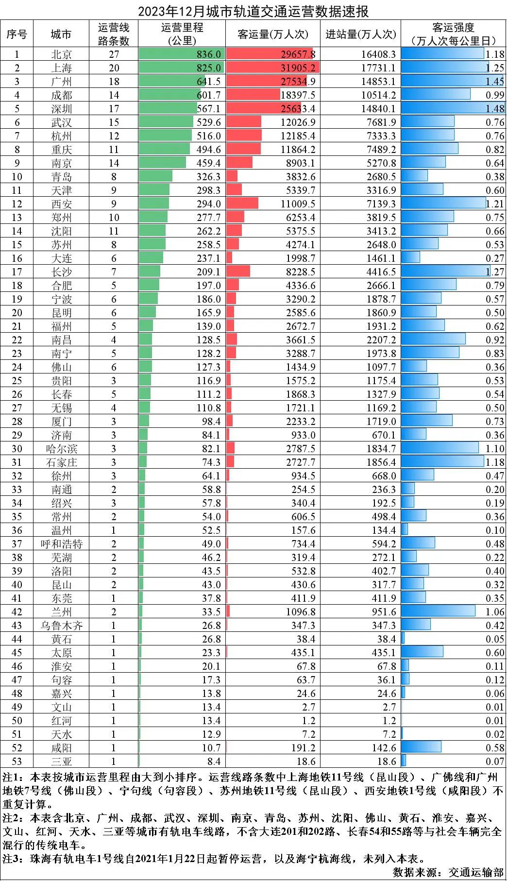2023年12月,31個(gè)?。ㄗ灾螀^(qū)、直轄市)和新疆生產(chǎn)建設(shè)兵團(tuán)共有55個(gè)城市開通運(yùn)營(yíng)城市軌道交通線路306條,運(yùn)營(yíng)里程10165.7公里,實(shí)際開行列車333萬列次,完成客運(yùn)量26.7億人次,進(jìn)站量16億人次。12月份,客運(yùn)量環(huán)比增加0.8億人次,增長(zhǎng)3.2%,同比增加15.1億人次,增長(zhǎng)130.1%,較2019年月均客運(yùn)量增加6.8億人次,增長(zhǎng)34%。12月份全國(guó)總運(yùn)營(yíng)里程的平均客運(yùn)強(qiáng)度為0.863萬人次每公里日,較2019年全國(guó)總運(yùn)營(yíng)里程的平均客運(yùn)強(qiáng)度降低18.6%。