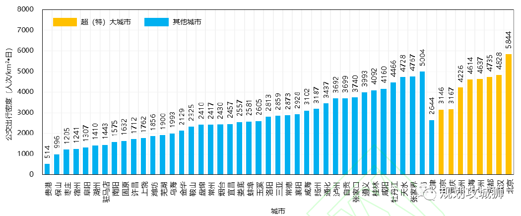 為定量衡量公共汽車(chē)出行低密度地區(qū),以“十三五”時(shí)期開(kāi)展公交都市創(chuàng)建的地級(jí)市為例,統(tǒng)計(jì)相應(yīng)城市市轄區(qū)日均公共汽車(chē)出行量和建成區(qū)面積,計(jì)算公共汽車(chē)出行密度,并與廣州、北京等超(特)大城市進(jìn)行對(duì)比(見(jiàn)圖1)。從結(jié)果來(lái)看,不同城市公共汽車(chē)出行密度差異較大,“十三五”時(shí)期公交都市創(chuàng)建城市公共汽車(chē)出行密度平均值為2 700 人次·km2/d,低于超(特)大城市平均值(4 200 人次·km2/d);公共汽車(chē)出行密度低于2 000 人次·km2/d 的城市數(shù)量約占1/3。為進(jìn)一步理論驗(yàn)算公共汽車(chē)出行密度,參考既有研究,人口低密度地區(qū)的下限標(biāo)準(zhǔn)為0.5 萬(wàn)人·km-2,并借鑒《城市綜合交通體系規(guī)劃標(biāo)準(zhǔn)》(GB/T 51328—2018)中人均出行次數(shù)為2.3~2.5 次·人-1·d-1、公共汽車(chē)出行分擔(dān)率為10%~20%的參數(shù)設(shè)定,計(jì)算得到公共汽車(chē)出行低密度理論值約為1 150~2 500 人次·km2/d。因此,綜合考慮中國(guó)城市現(xiàn)狀和理論測(cè)算,本文提出將出行密度低于2 000 人次·km2/d 的地區(qū)視為公共汽車(chē)出行低密度地區(qū)。