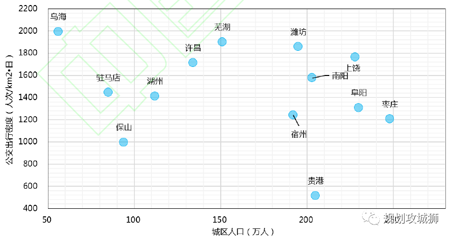 同樣以“十三五”時(shí)期開(kāi)展公交都市創(chuàng)建的地級(jí)市為例,按照公共汽車(chē)出行低密度地區(qū)的界定標(biāo)準(zhǔn),分別統(tǒng)計(jì)城區(qū)人口規(guī)模 (見(jiàn)圖2)??梢园l(fā)現(xiàn),屬于公共汽車(chē)出行低密度地區(qū)的城市,城區(qū)人口規(guī)模在250 萬(wàn)人以?xún)?nèi),總體上看,該類(lèi)地區(qū)仍普遍存在于中小城市和部分Ⅱ型大城市。