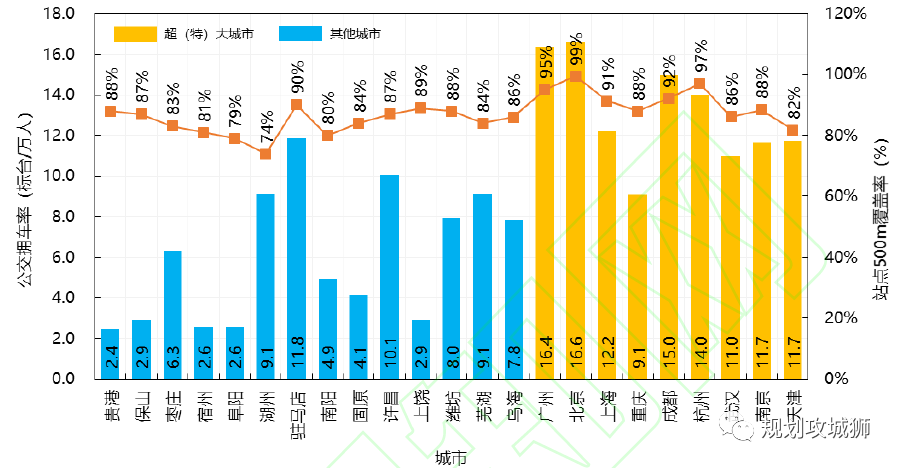 參考既有研究,進(jìn)一步統(tǒng)計(jì)公共汽車(chē)出行低密度地區(qū)公共汽車(chē)擁車(chē)率和車(chē)站500 m覆蓋率(見(jiàn)圖3),并計(jì)算公共汽車(chē)全方式出行分擔(dān)率。公共汽車(chē)擁車(chē)率指標(biāo)方面,不同地區(qū)發(fā)展差異較大,指標(biāo)范圍約為2~12 標(biāo)臺(tái)/萬(wàn)人,而超(特)大城市這一指標(biāo)的波動(dòng)范圍為9~16 標(biāo)臺(tái)/萬(wàn)人,同時(shí)6 標(biāo)臺(tái)/萬(wàn)人的平均水平也低于超(特)大城市的13 標(biāo)臺(tái)/萬(wàn)人。