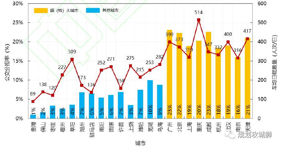 車(chē)站500 m 覆蓋率指標(biāo)方面,不同地區(qū)普遍超過(guò)80%,與超(特)大城市基本持平,無(wú)明顯差距。然而,公共汽車(chē)出行分擔(dān)率和車(chē)均日載客量遠(yuǎn)低于超(特)大城市(見(jiàn)圖4)。公共汽車(chē)出行低密度地區(qū)出行分擔(dān)率基本不高于10%,平均值約為5%,車(chē)均日載客量多低于300人次/d;而特大城市公共汽車(chē)出行分擔(dān)率約為20%,車(chē)均日載客量基本超過(guò)300 人次/d??傮w上看,公共汽車(chē)出行低密度地區(qū)的出行分擔(dān)率水平普遍滯后于擁車(chē)率和車(chē)站覆蓋率水平,原因是擁車(chē)率和車(chē)站覆蓋率主要受建設(shè)投入影響,通過(guò)增加投入能較快提高指標(biāo)水平,而公共汽車(chē)出行分擔(dān)率影響因素多,通過(guò)單一建設(shè)投入難以有效提高水平。
