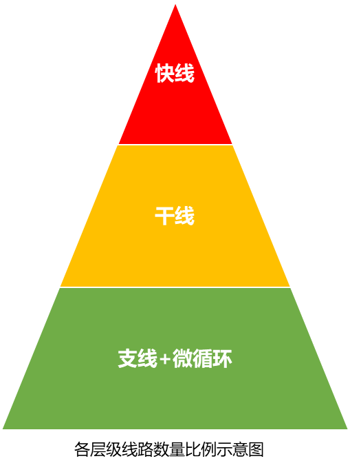 總體線網(wǎng)以支線和微循環(huán)線路為主體,數(shù)量最多;干線為中流砥柱,數(shù)量次之;快線構(gòu)建高品質(zhì)線網(wǎng),數(shù)量較少。
