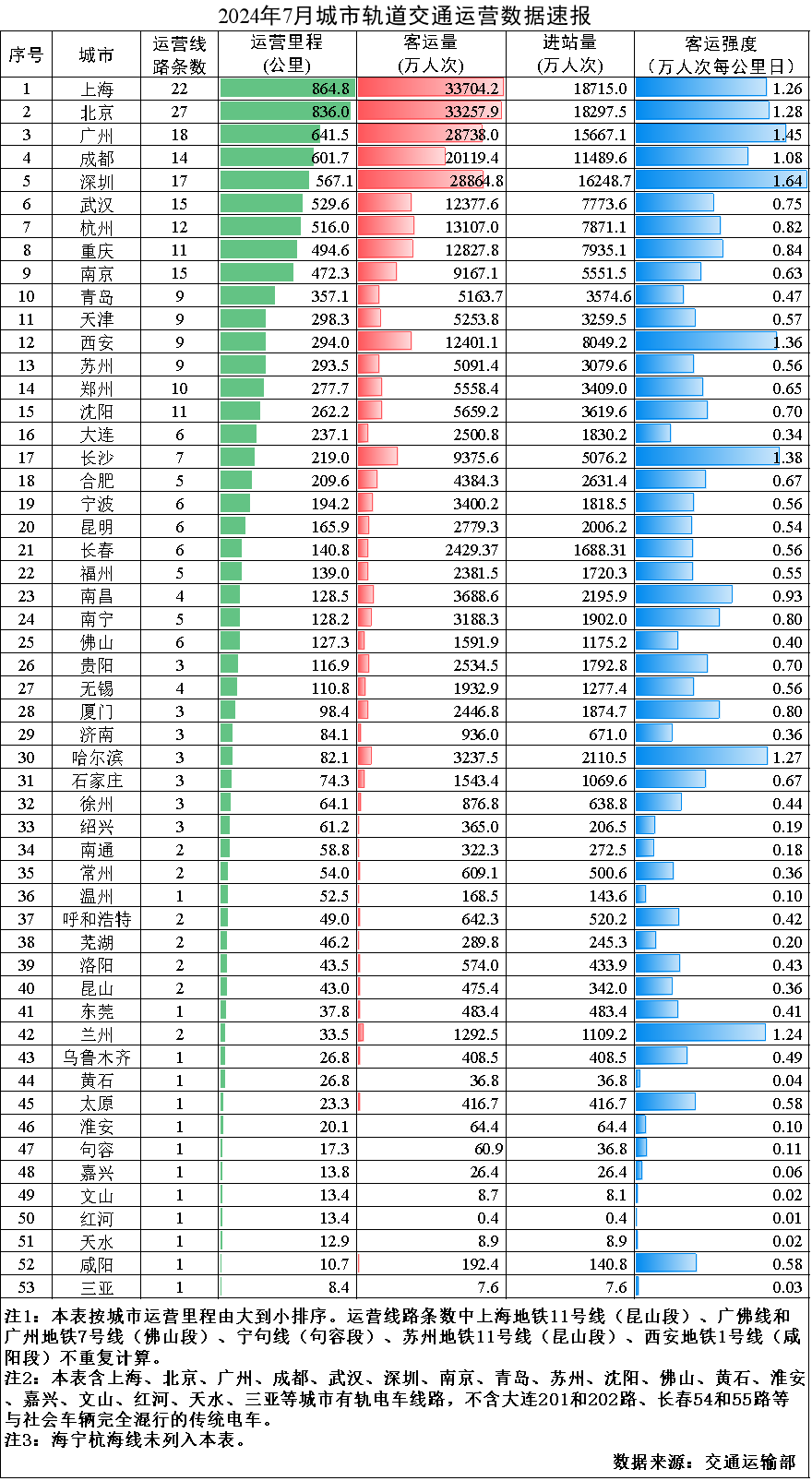 2024年7月,31個(gè)?。ㄗ灾螀^(qū)、直轄市)和新疆生產(chǎn)建設(shè)兵團(tuán)共有54個(gè)城市開通運(yùn)營城市軌道交通線路311條,運(yùn)營里程10339.4公里,實(shí)際開行列車350萬列次,完成客運(yùn)量28.7億人次,進(jìn)站量17.2億人次。7月份,客運(yùn)量環(huán)比增加2.5億人次,增長9.4%,同比增加2.0億人次,增長7.6%。7月份全國總運(yùn)營里程的平均客運(yùn)強(qiáng)度為0.896萬人次每公里日,環(huán)比增長5.5%,同比增長1.6%。本月無新開通線路。