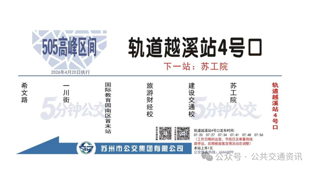 4月20日起,蘇州公交集團將推出首條“5分鐘公交線路”——505路高峰區間,專為國際教育園片區師生打造,用五個“5”的精密設計,重新定義“最后一公里”接駁的精細化出行。