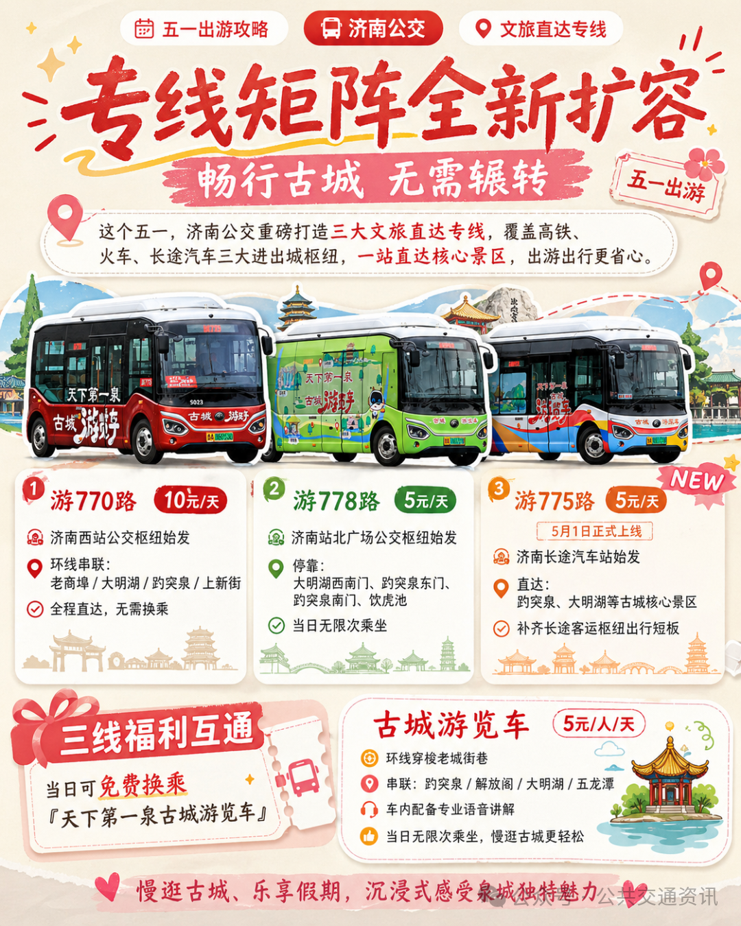 這個“五一”,濟南公交重磅打造三大文旅直達專線+“天下第一泉古城游覽車”,覆蓋高鐵、火車、長途汽車三大進出城樞紐,一站直達核心景區,出游出行更省心。