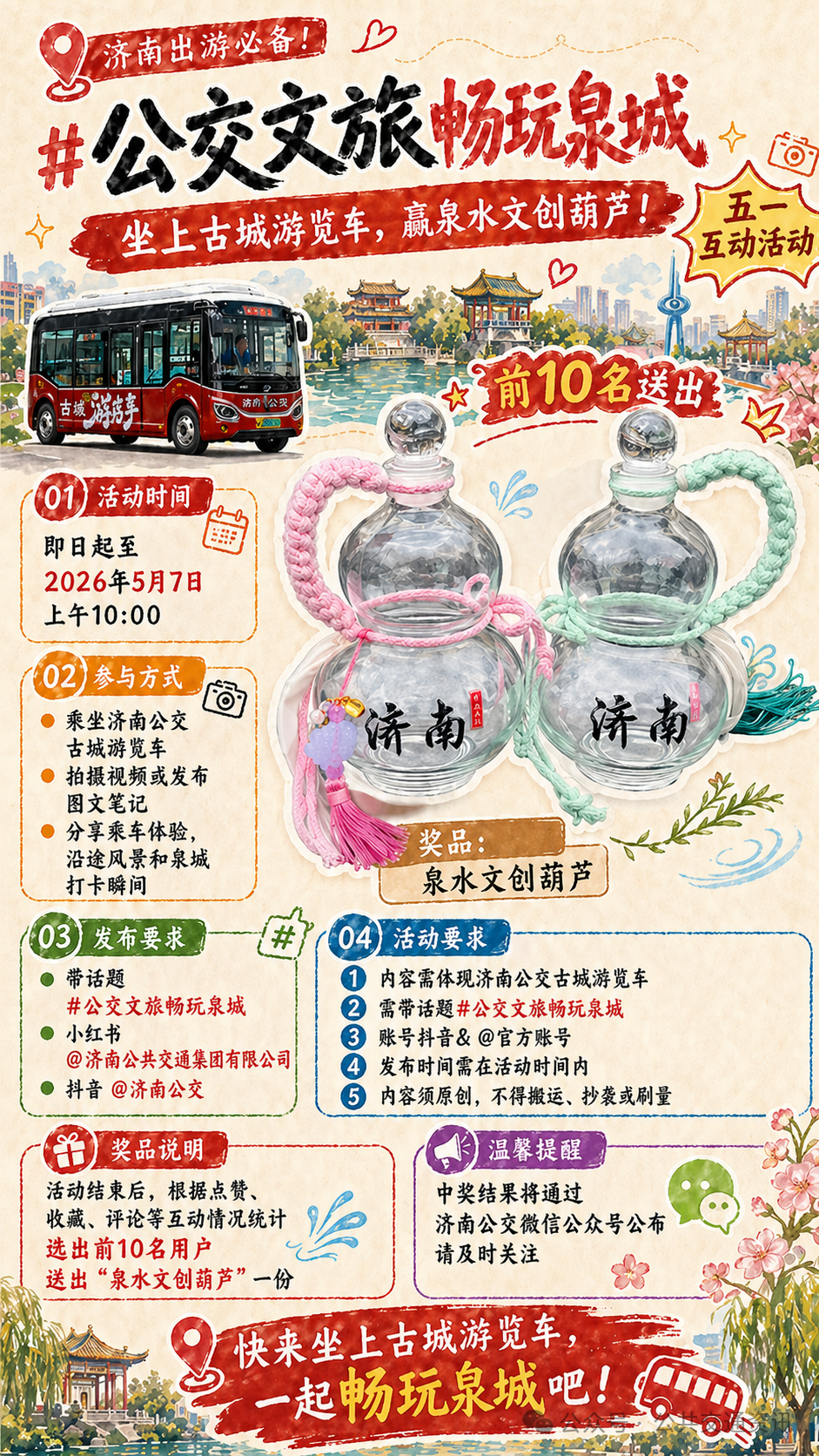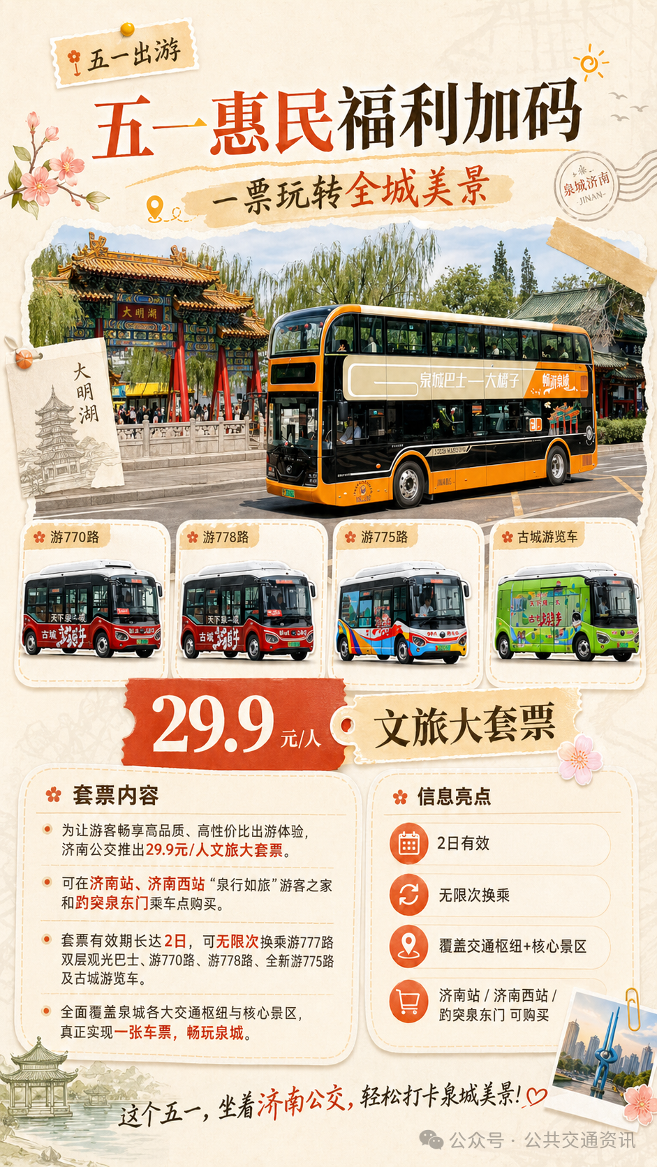 春風十里赴泉城,美好“五一”正當時!“五一”假期將至,為全力滿足廣大市民游客出行需求,深化“公交+文旅”融合發展,濟南公交全面升級文旅出行服務矩陣,擴容景區專線、優化出行網絡、疊加惠民福利,邀八方賓客乘公交、逛古城、賞泉韻,一張車票輕松解鎖泉城絕美風光。