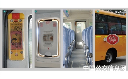 CAN儀表,車內(nèi)外監(jiān)控系統(tǒng),無盲區(qū)倒車鏡,停車信號臂,前、后路牌(選裝),GPS,電動擊窗器(選裝),電子鐘,校車標志燈